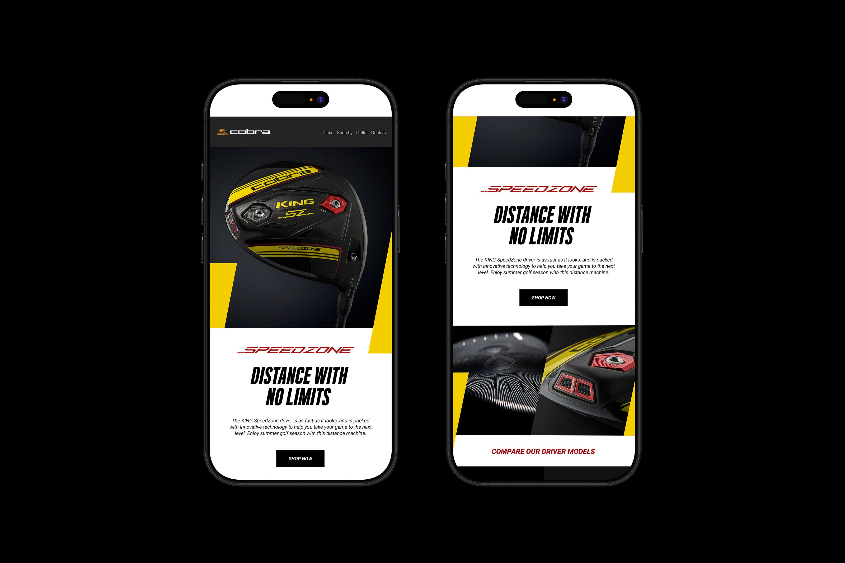 Cobra’s Speedzone line was built for performance, engineered to be the fastest across every club in the bag. Partnering with creative agency Fear Not, we helped bring the full campaign to life digitally—from product storytelling to the user experience. To capture the essence of speed, we reimagined the product landing page with a horizontal scroll, creating a visual rhythm that mirrored the energy of the brand. From collaborating with Justin Kosman on the photography direction to designing web and email experiences across the product line, the Speedzone launch delivered a cohesive and impactful digital presence that matched Cobra’s bold innovation.