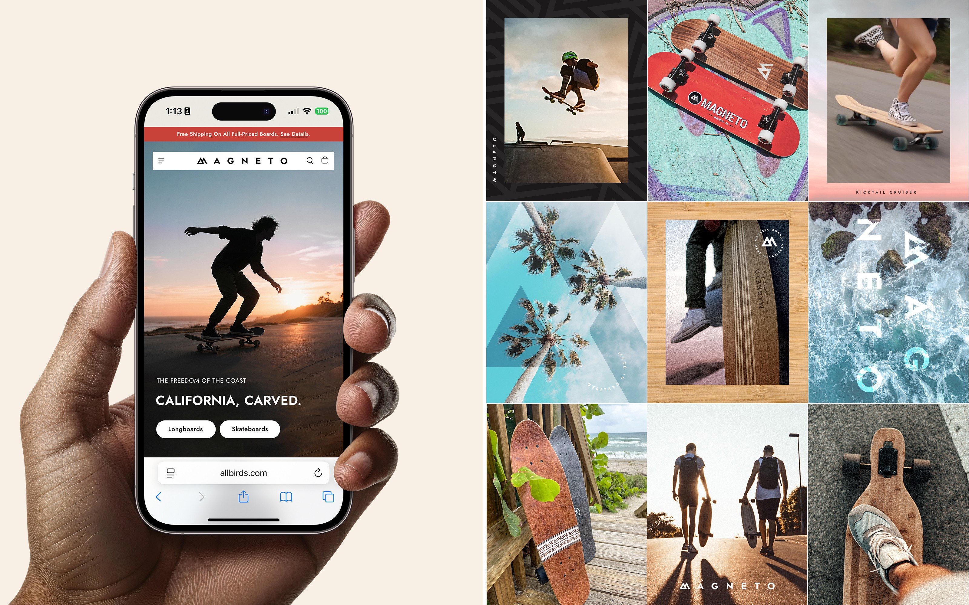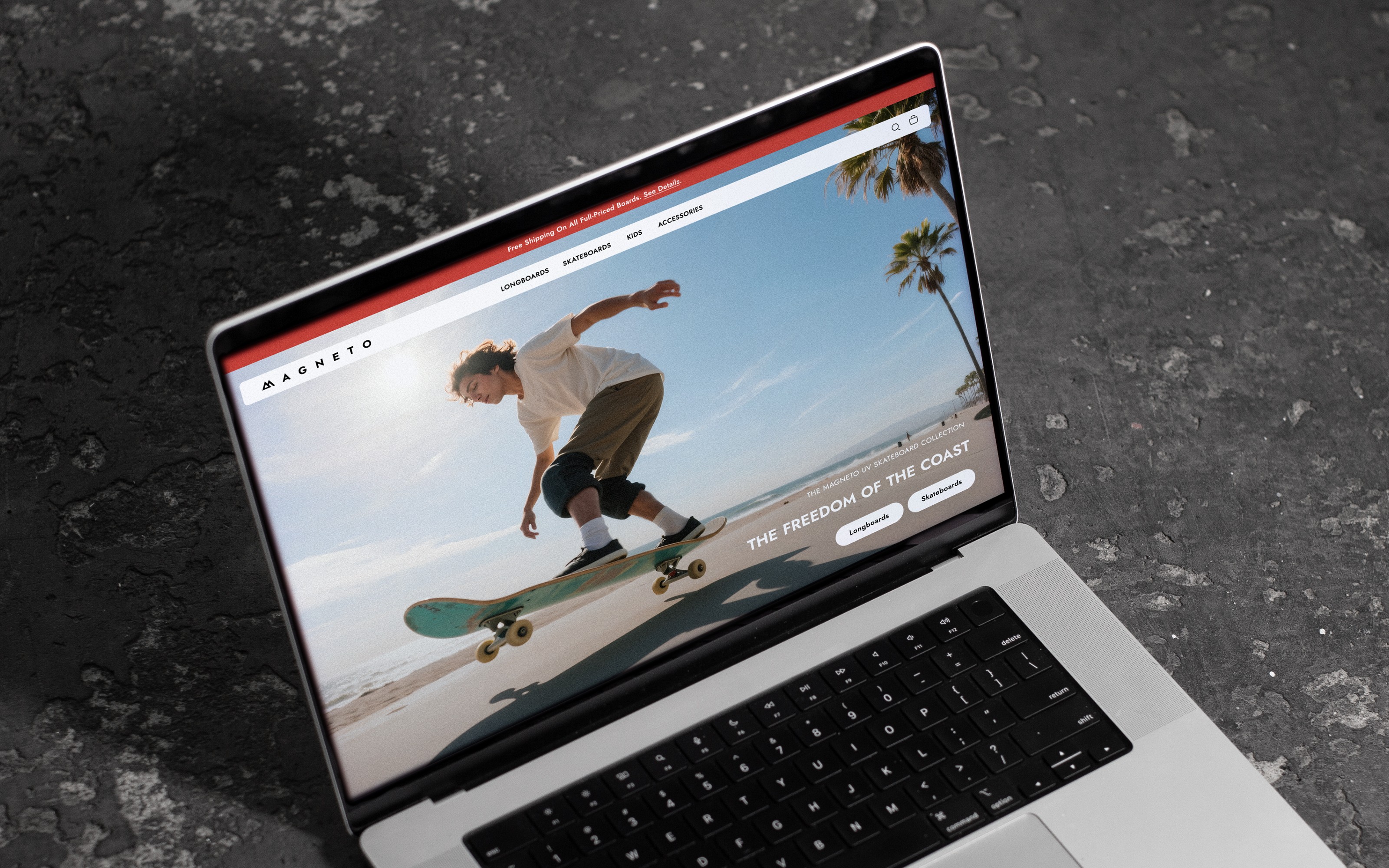 The creative direction for Magneto Boards was grounded in the authentic lifestyle and environment of Carlsbad, California. The refreshed identity drew inspiration from the natural materials used to craft the boards, such as bamboo and maple, as well as the gradients of coastal skies, sandy tones, and the grit of asphalt. These references established an aesthetic that felt organic, lived-in, and true to the culture of skating. The existing logo was modernized and expanded into a flexible identity system that included new color palettes, patterns, and additional logo treatments. This system was designed for adaptability, allowing it to work seamlessly across all touchpoints, from board graphics and retail displays to digital platforms and merchandise. With the foundation in place, the rebrand was expressed across the full brand experience. The website and social media presence were reimagined with an emphasis on clarity, lifestyle-driven imagery, and storytelling that highlighted both product and culture. Packaging and retail environments paired raw, tactile textures with refined finishes, giving the boards a compelling presence. Merchandise extended the identity further, transforming apparel and accessories into wearable expressions of the brand. The result is a brand world that positions Magneto as aspirational yet approachable—polished enough to feel professional and credible, while remaining accessible to skaters of all levels. The refreshed identity celebrates the spirit of California skate culture and establishes a cohesive, confident voice across every interaction.
